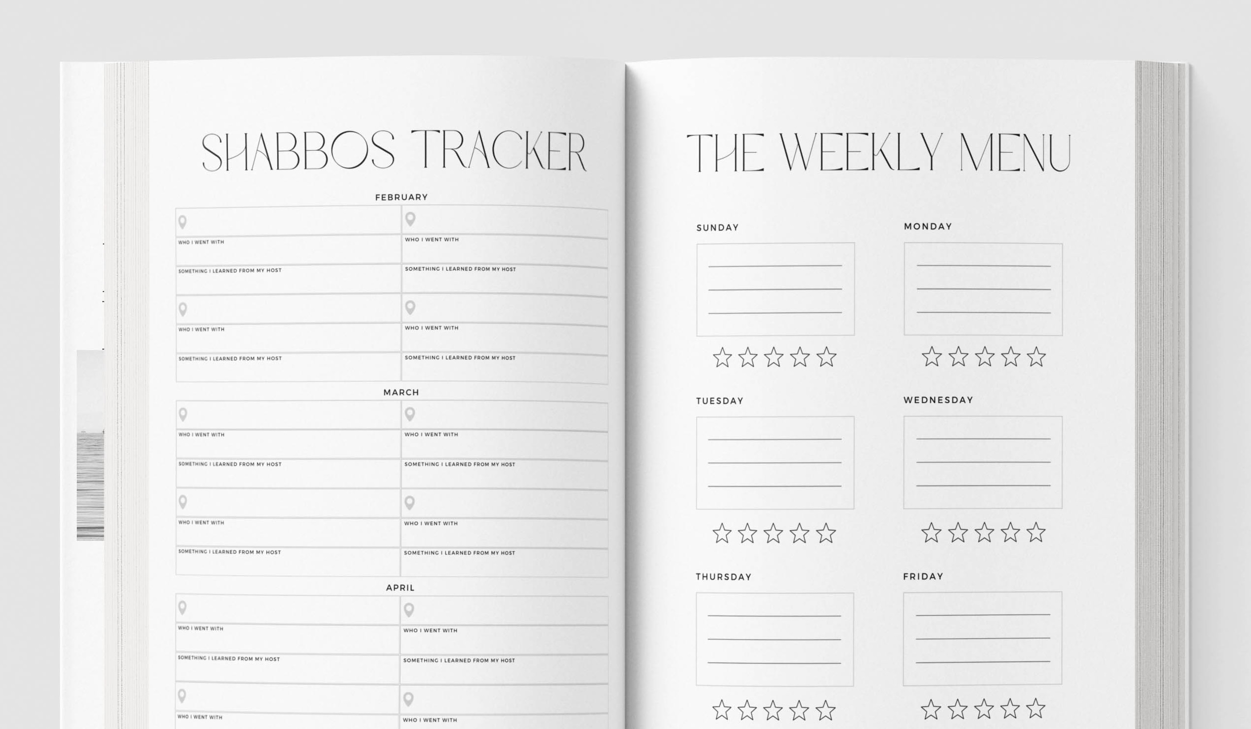 Track the essentials —Shabbos plans, sleep schedules, travel adventures, moods, and all your Shabbos host contacts in one place. Your year, organized and unforgettable.